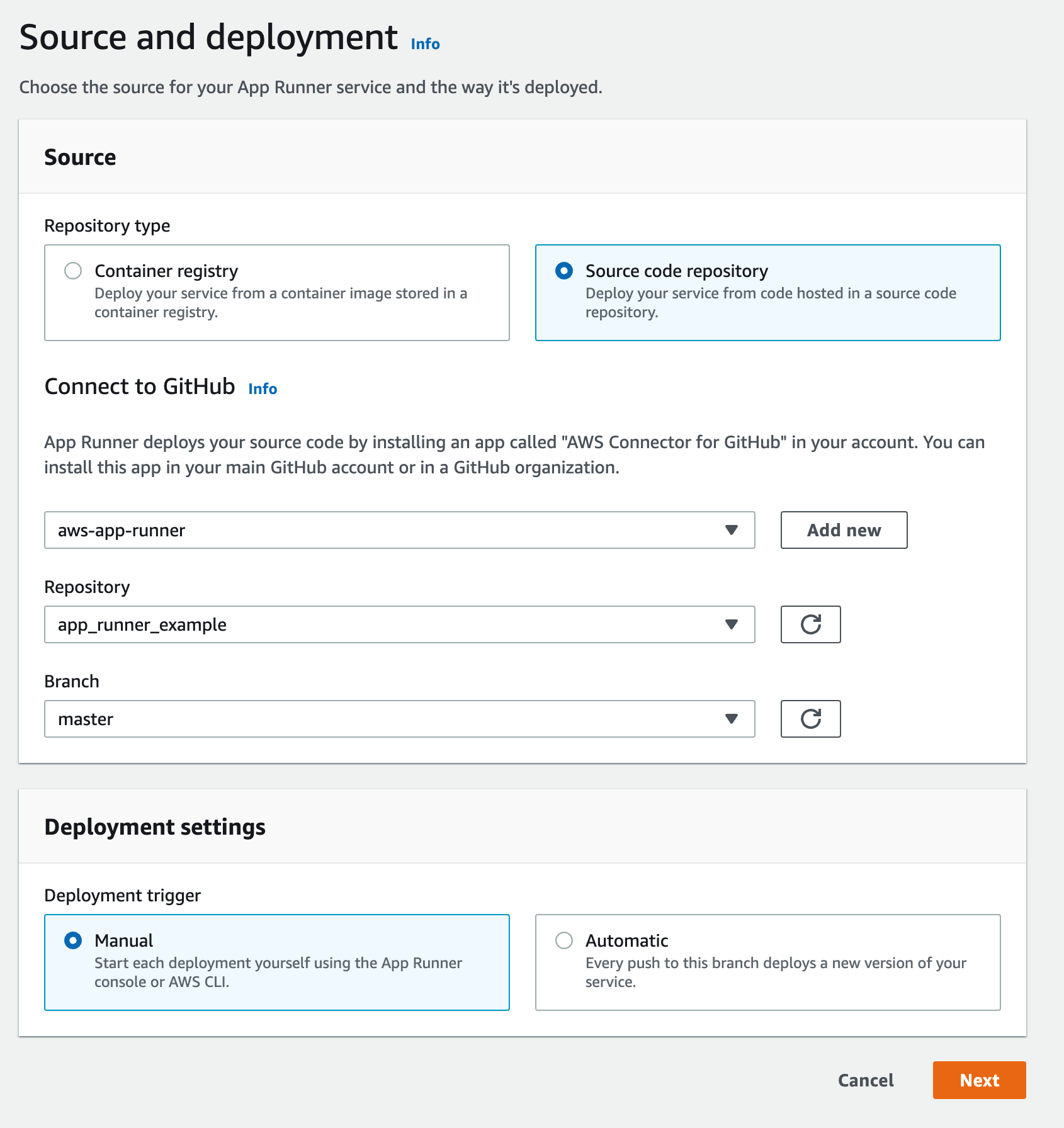 You have two options to deploy your code to the App Runner. You can either share your Github repo with AWS or register your docker image to ECR. In this tutorial, we will share our Github repo with App Runner. Create a github repo for your project and push your code. In AWS console open the App Runner service. Click onCreate Service button. Select