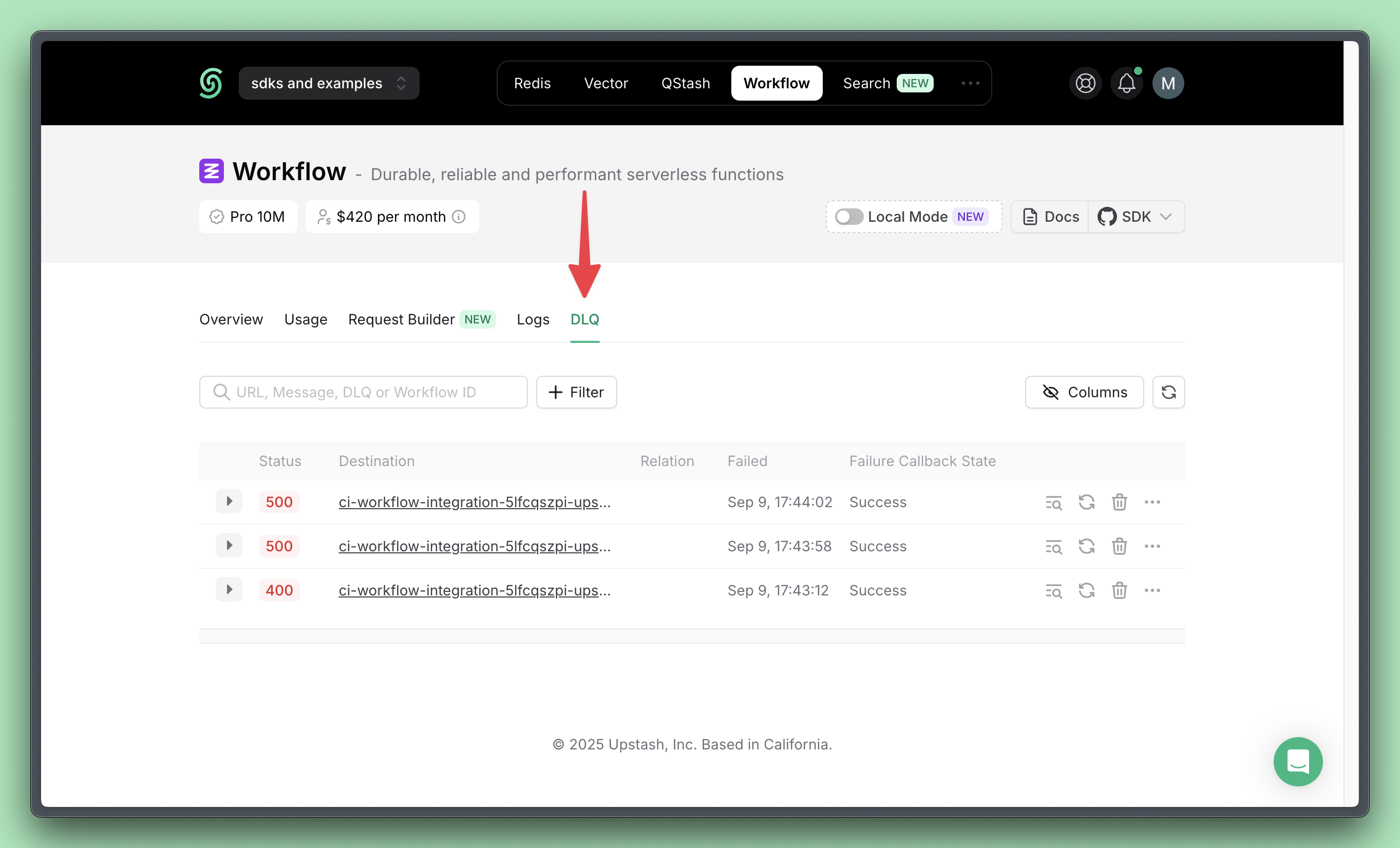 When a workflow step fails and exhausts all configured retries, Upstash Workflow automatically moves the failed run to the DLQ. This happens automatically without any additional configuration required.