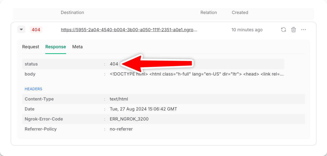 In your DLQ, filter messages via the Workflow URL or Workflow Run ID to search for a particular failure. We include all request and response headers and bodies to simplify debugging failed runs. For example, let’s debug the following failed run. Judging by the status code 404, the Ngrok-Error-Code header of ERR_NGROK_3200 and the returned HTML body, we know that the URL our workflow called does not exist.