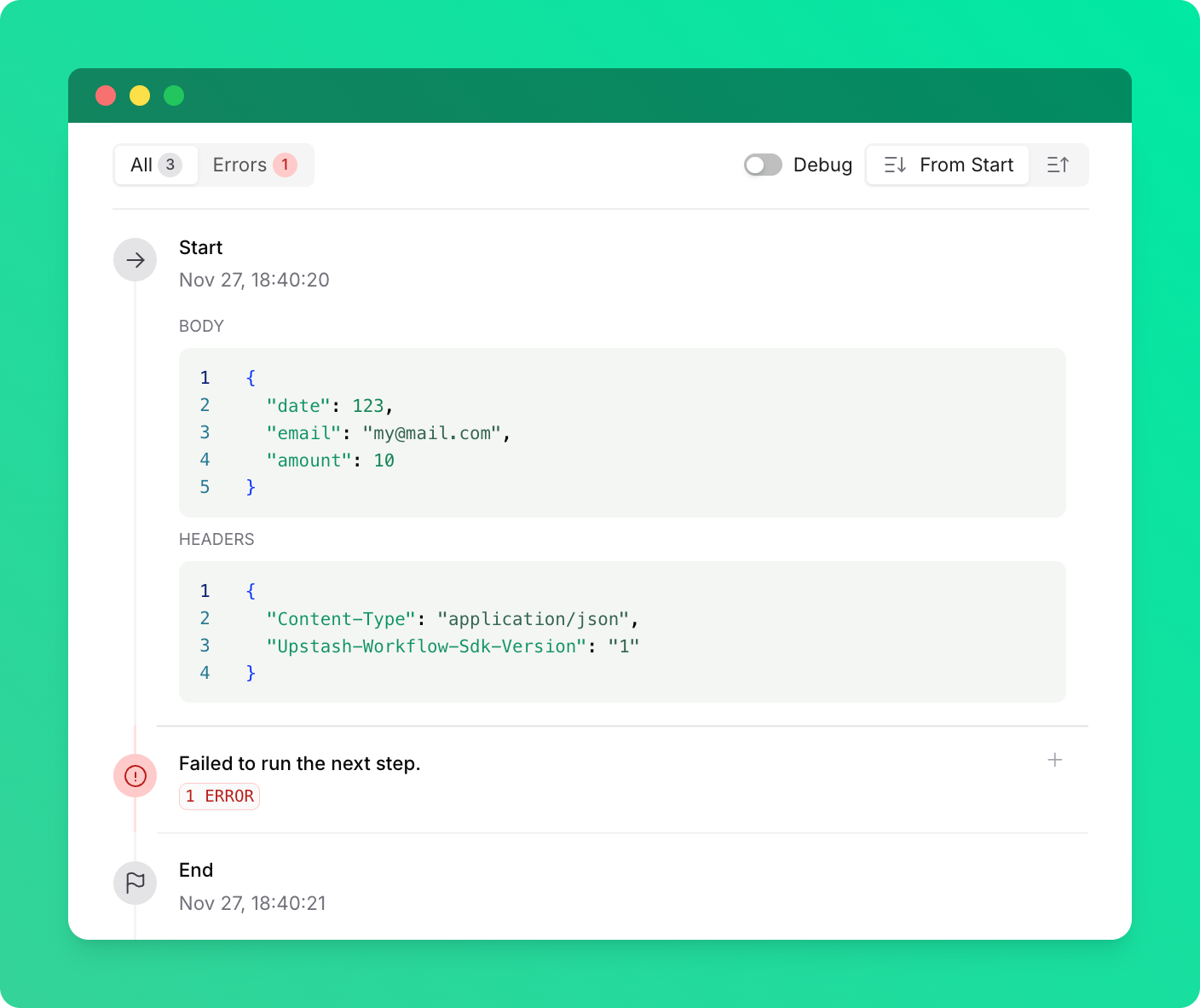 Imagine that you trigger your workflow with client.trigger and the workflow starts (you see the run in the dashboard), but it doesn’t proceed beyond the first step. If it appears like the initial step has failed: